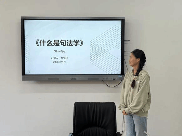 据悉,自十月份起,读书分享会已成功举办至第三期。首期活动由2024级卢彦君同学就汉语复合词进行汇报,第二期由2025级胡皓辰同学分享词类与语法范畴相关内容。本系列活动致力于培养学生发现问题与乐于思辨的能力,通过搭建师生互动的学术交流平台,引导学生深入研读专业文献,主动探索语言学领域的复杂问题。