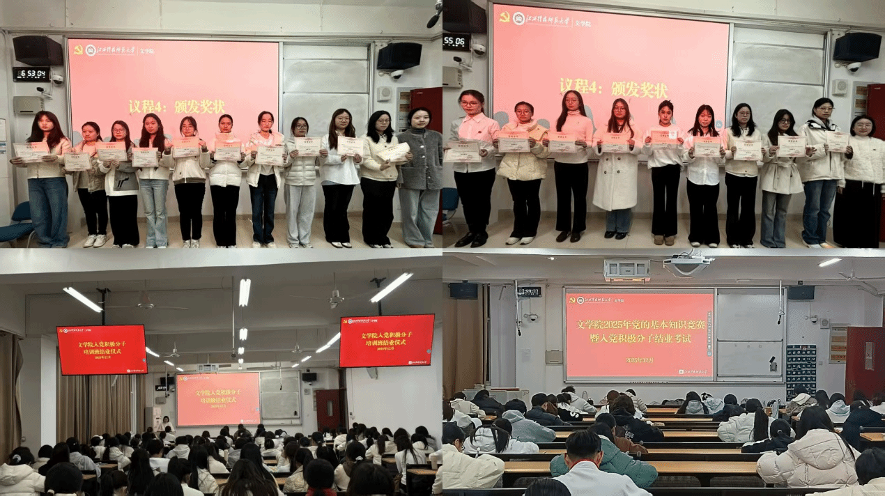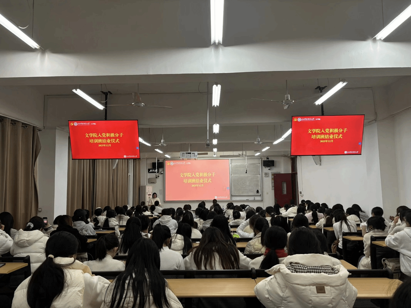 为深入学习贯彻党的创新理论,切实加强入党积极分子培养教育,提升党员发展质量,近期,文学院党委成功举办了2025年入党积极分子培训班。本次培训紧密围绕新时代党的建设总要求,结合当前深入学习贯彻党的二十届四中全会精神、积极展望国家“十五五”发展蓝图的重要契机,着力为党组织输送信仰坚定、素质过硬的合格后备军。随着结业考核与总结工作的顺利完成,本期培训班各项教学任务圆满收官。