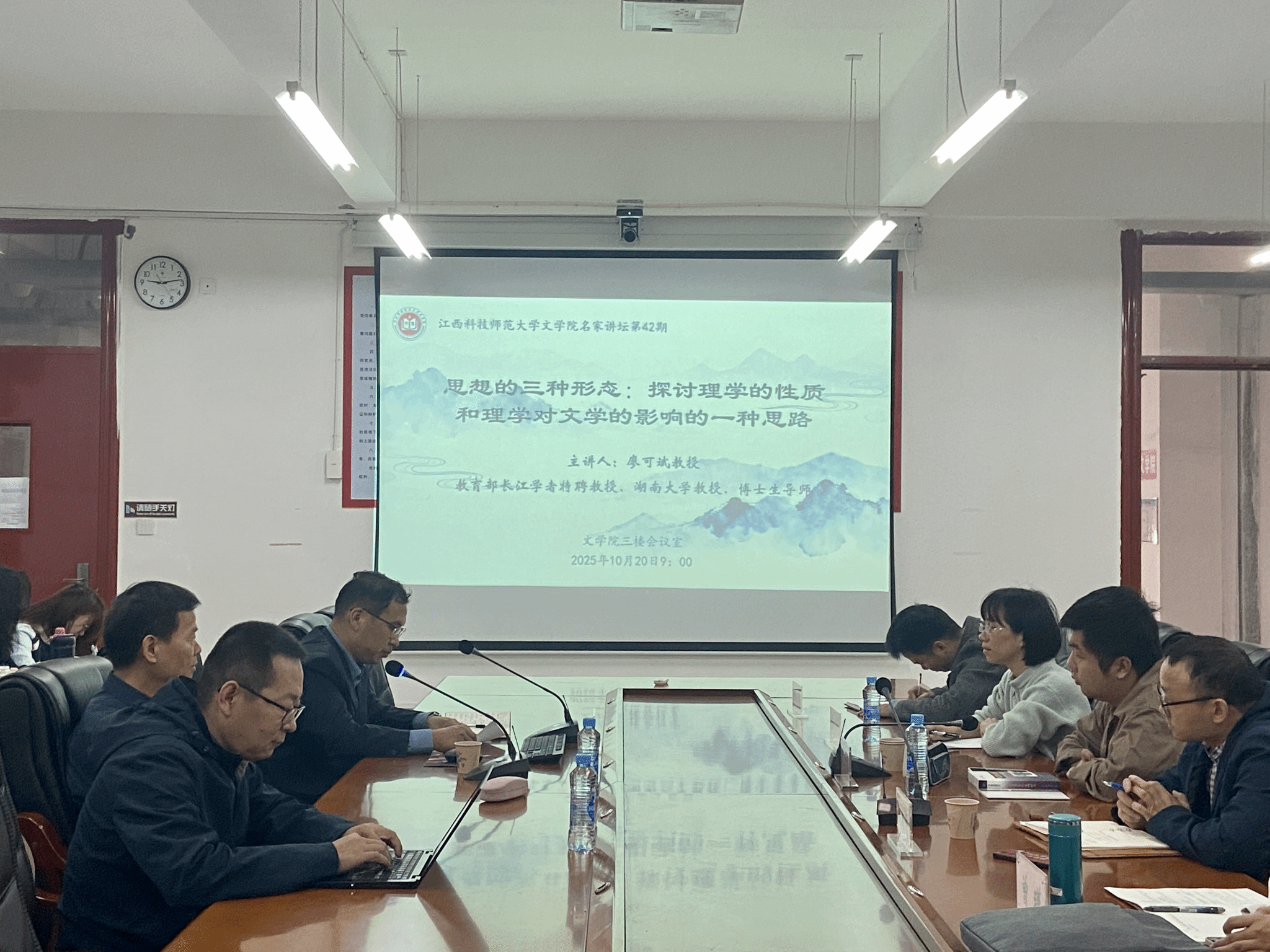 2025 年 10 月 20 日,江西科技师范大学文学院名家讲坛第 42 期在文学院W1310会议室开讲。文学院邀请教育部长江学者特聘教授、湖南大学博士生导师廖可斌教授莅临学院讲学。廖教授以《思想的三种形态:探讨理学的性质和理学对文学的影响的一种思路》为题,带来一场学术盛宴。本次会议由陈绪平院长主持,师生代表50余人参与此次讲座。