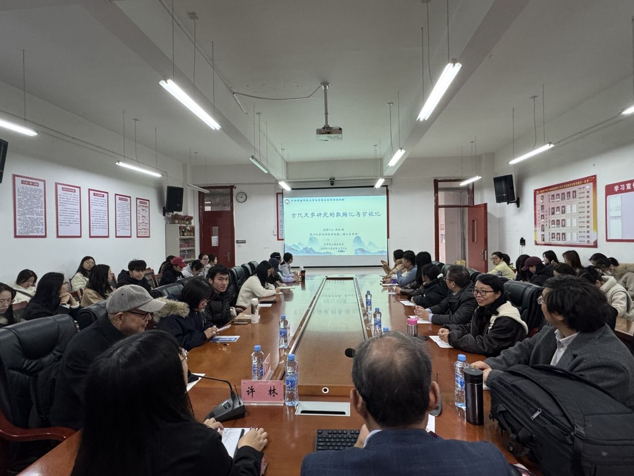 2025年11月23日,江西科技师范大学文学院名家讲坛第43期在文学院W1310会议室开讲。四川大学文科讲席教授、博士生导师王兆鹏教授应邀莅临我校,为师生带来题为《谈古代文学研究的数据化与可视化》的专题讲座。本次讲座由许林副院长主持,师生代表50余人到场聆听。