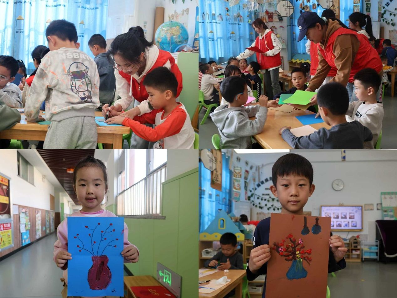 活动现场,文学院青年志愿者以充满童趣的语言为孩子们解锁立冬的文化密码——既生动解读“水始冰、地始冻、雉入大水为蜃”的物候奥秘,又结合气温变化、南北习俗差异与冬季养生小常识,让孩子们在欢声笑语中感知节气与生活的紧密联结。创意手作环节更是热闹非凡,文学院青年志愿者手把手带领孩子们剪裁卡纸、勾勒寒梅、点缀瓶身,用斑斓色彩勾勒冬日雅趣,用灵巧双手编织童真想象。伴随着清脆的笑声,一幅幅充满诗意的手工作品新鲜出炉,将活动现场装点得暖意融融、童趣盎然。