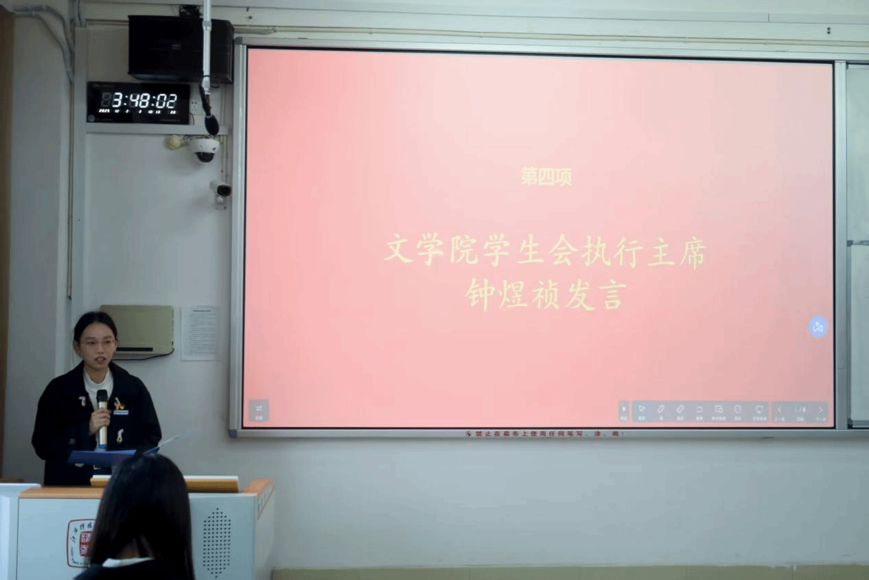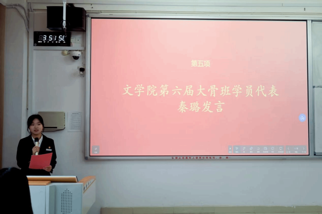 文学院学生会执行主席钟煜祯作为学生骨干代表发言。呼吁全体学员珍惜难得的培训机会,在思想淬炼中坚定方向,在实践锻炼中提升综合素养,以青春之我、奋斗之我,为文学院的发展建设贡献坚实的青春力量。学员代表秦璐上台发言,她表示未来将以饱满的热情、最务实的作风参与培训。