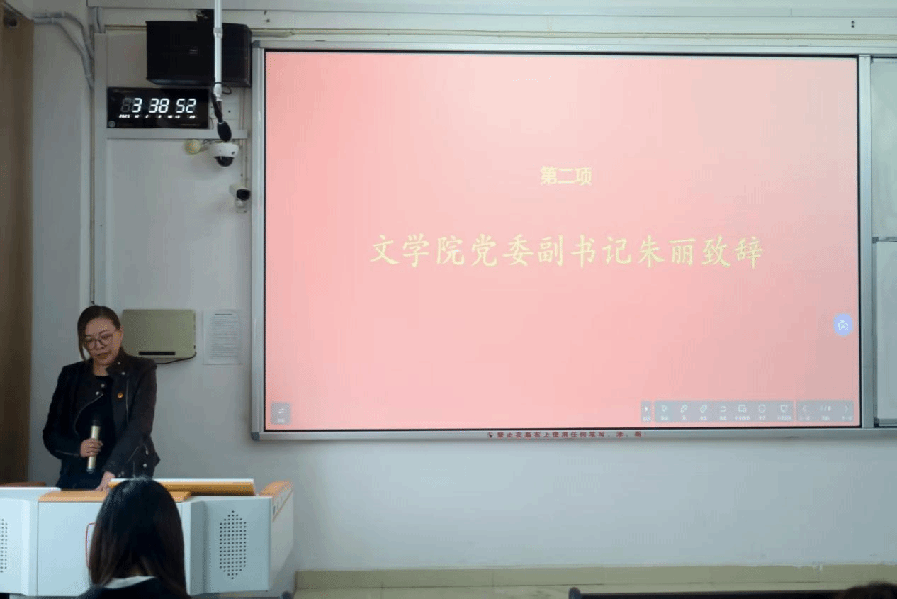 仪式在庄严的国歌声中拉开序幕,全体成员肃立奏唱,激昂旋律为开班仪式奠定庄重基调。文学院党委副书记朱丽致辞,她深入阐释“青马工程”培养新时代青年骨干的核心意义,鼓励学员以青马培训为契机,融理论学习与实践行动,成长为可堪大用、能担重任的青年先锋。