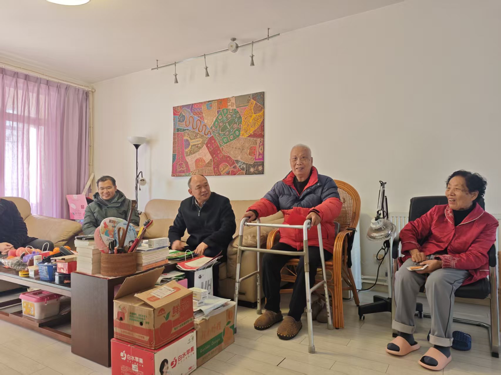 此次慰问活动走访了四位退休老同志,每到一处,学院领导与老同志及其家属促膝长谈,倾心交流,汇报了学院过去一年在学科建设、人才培养、学术科研、师资建设等领域面取得的成绩;同时,悉心询问老同志的身体康健、生活起居与实际需求,耐心倾听其对学院未来发展的真知灼见,衷心感谢老同志们虽退岗却不退责,始终心系学院、默默赋能。交谈中,领导班子反复叮嘱老同志们保重身体、颐养身心,安享福寿康宁的晚年生活。