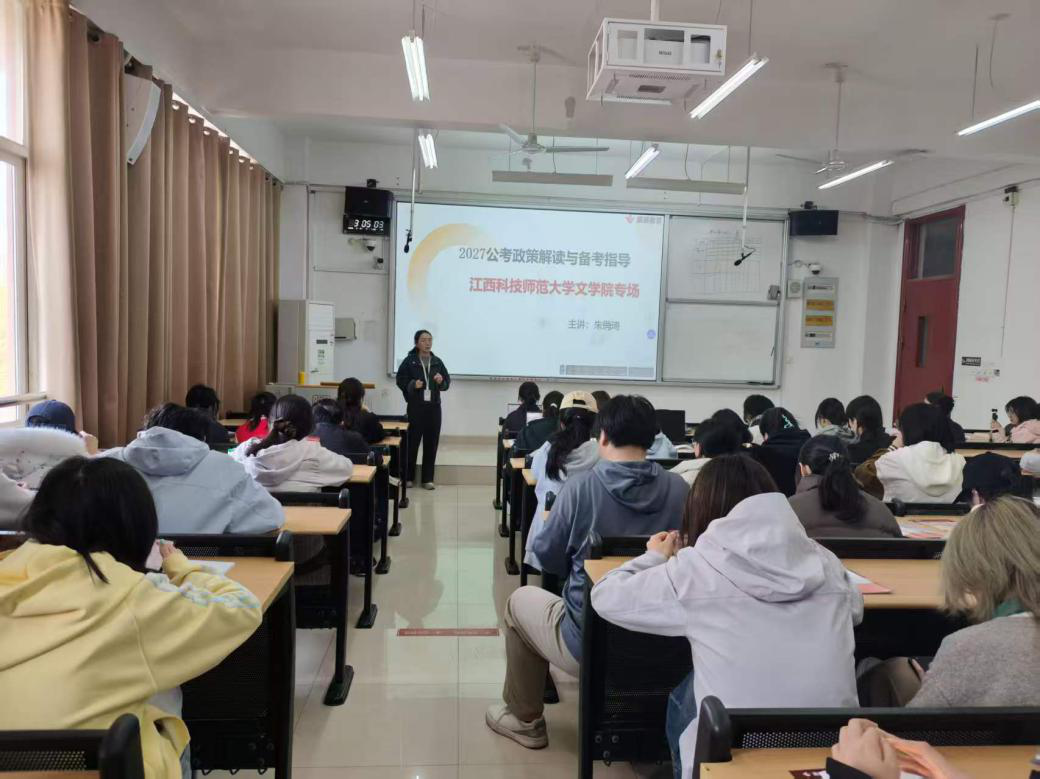 同日下午,紧接着江西展鹏教育资深公考讲师结合最新公考形势,系统梳理公务员考试流程、报考要求与备考核心要点。讲座针对行政职业能力测验、申论两大科目,详细拆解题型特点、答题思路与应试技巧。讲座内容紧贴学生实际需求,助力学子全面掌握考情动态,合理规划职业发展路径。